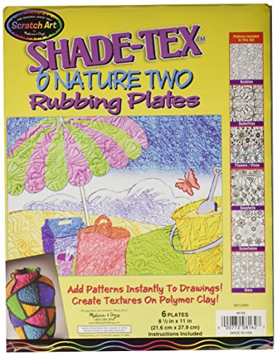 Product Description Create countless patterns on paper, foil, even clay! Textured designs are molded right into these flexible and sturdy plastic rubbing plates. It's easy to add intriguing patterns to drawings, greeting cards, murals and collage, or achieve cross-hatching, halftones or pointillistic designs. Obtain dramatic results with crayons, colored pencils and graphite pencils. Creates striking impressions when pressed into clay, too. Includes set of six 8.5" x 11" plates, one of each texture: bubbles, butterflies, flowers and vines, seashells, snowflakes and stars. SHP5 For more than 30 years, Melissa & Doug has created beautifully designed imagination- and creativity-sparking products that NBC News called “the gold standard in early childhood play.” We design every toy to the highest quality standards, and to nurture minds and hearts. If your child is not inspired, give us a call and we'll make it right. Our phone number is on every product! From the Manufacturer From classic wooden toys to crafts, pretend play, and games, Melissa & Doug products provide a launch pad to ignite imagination and a sense of wonder in all children so they can discover themselves, their passions, and their purpose. Since the company’s founding more than 25 years ago, Melissa & Doug has consistently delivered innovative products that inspire open-ended thinking, encourage kids to see new possibilities, and offer Countless Ways to Play. It’s part of a bigger vision to Take Back Childhood. Because by giving children a true childhood with the space and freedom to explore their world, we give them a path to realizing their full potential!