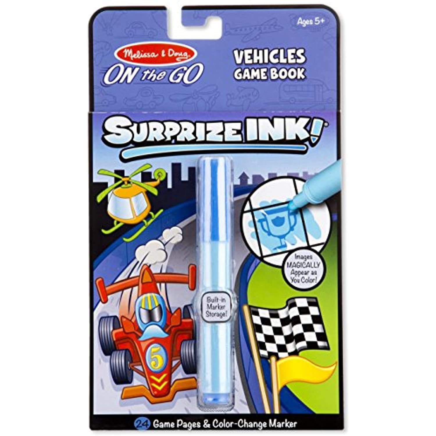 On the Go Game Books make the perfect travel toys! Each of these fun-packed activity books for kids includes an invisible-ink marker that stores right in the front cover. Pop it out to color in scenes, complete crosswords, follow mazes, find hidden pictures and more . . . and see SurprizeInk! images appear as you color! Includes 24 vehicle-themed pages, bound in a compact tablet format with a rigid back cover to support comfortable laptop coloring.