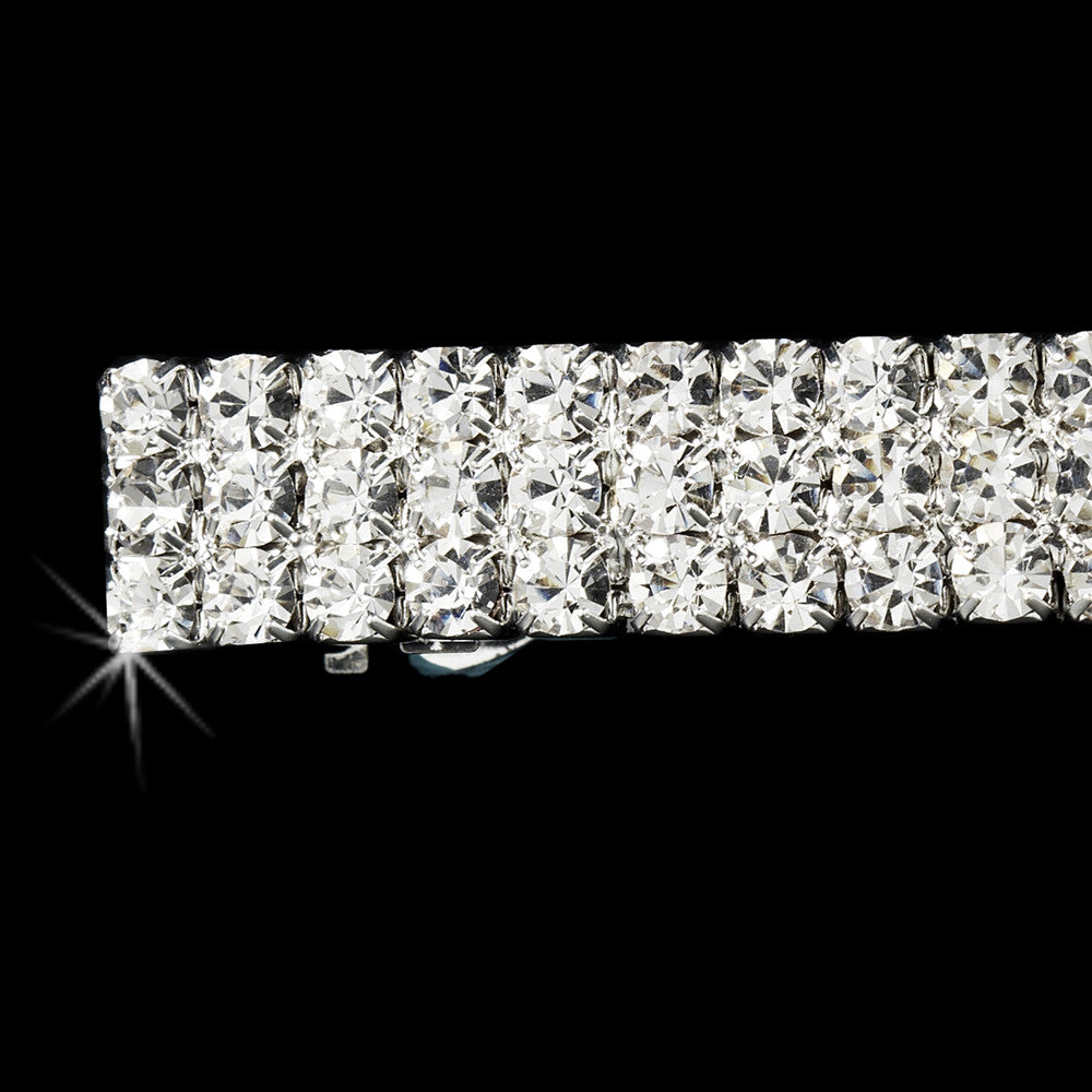 Three rows of sparkling, clear Swarovski crystals will draw attention to your beautiful up-do and add that needed touch of extra sparkle on your wedding day or any special occasion. This silver plated barrette measures approximately 3" in length and is 1/2" in width.