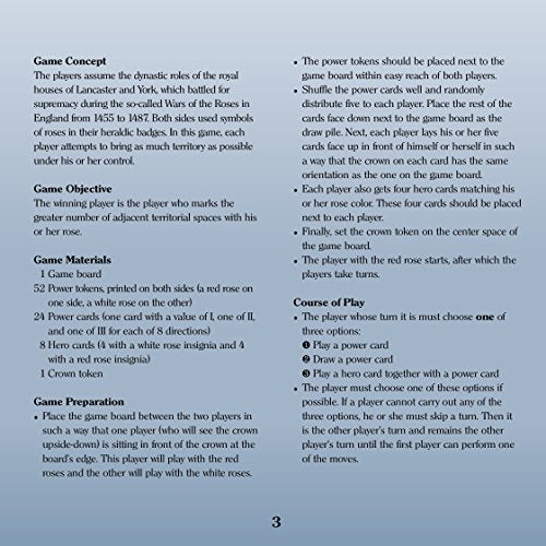 England, 15th century - on one side, The house of York, with its Heraldic badge featuring a single, snow white rose. And on the other side, The house of Lancaster, its own Heraldic rose depicted in blood Red. The war of The roses, a Dynastic struggle for control of the English crown, has erupted between the two houses. In this strategic game, one player commands the house of York and the other, The house of Lancaster. The players use their power cards to bring territories under their control, aiming to keep their territories as contiguous as possible. They also deploy their heroic Knights to take over enemy territories and cause surprising upsets. Who will be crowned England's new King?.