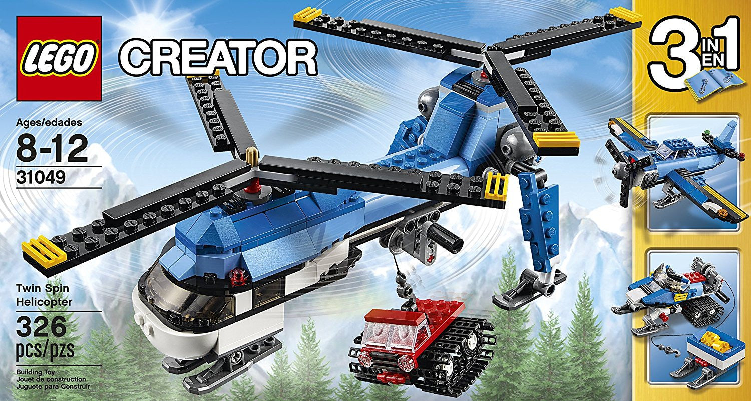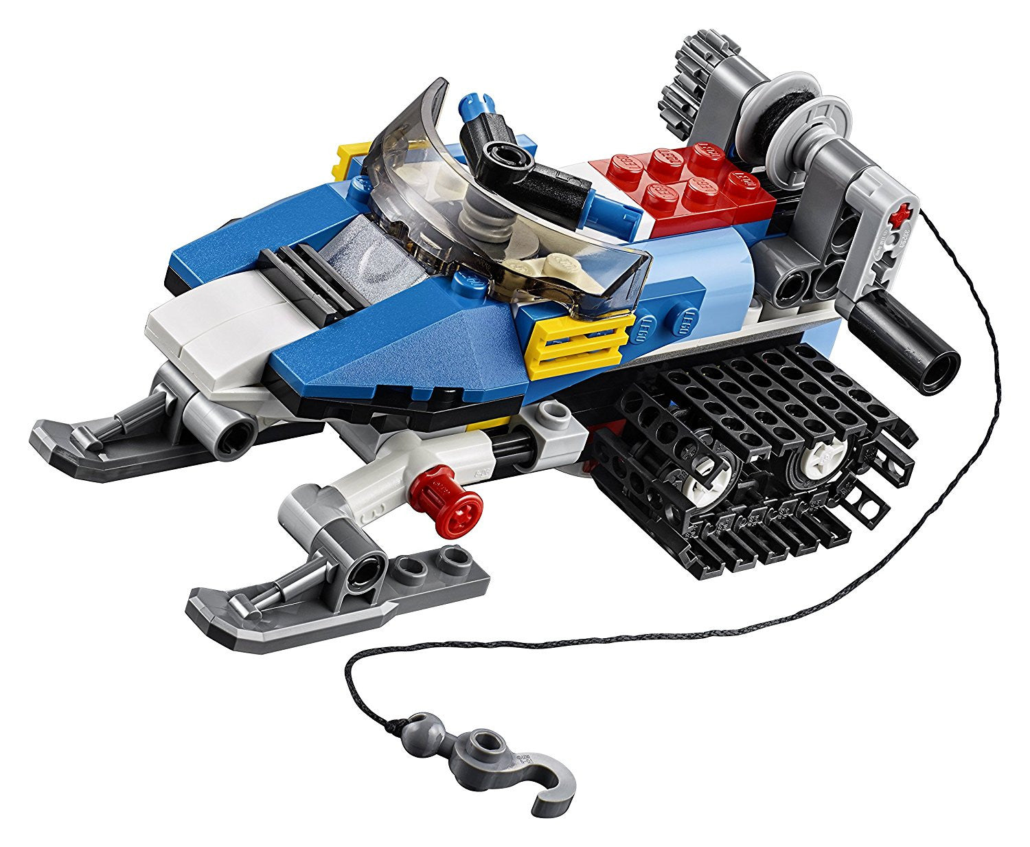 Power up the Twin Spin rotors of this awesome machine and take to the skies. Lower the winch, hook up the tracked snow cat vehicle and airlift it to its destination. Perform perfect landings on ice and snow with the helicopter's cool skis! The 3-in-1 LEGO Creator Twin Spin Helicopter features a high-tech design with a light-blue and white color scheme and can be rebuilt to create a snowmobile with functioning winch or a single-engine airplane with spinning propeller.