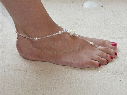 Sparkle in the sand wearing Mariell's playful barefoot sandal for beach & destination weddings. Our hand-crafted foot jewelry has a crystal and glass pearl cluster with a Genuine Sterling plated chain and beaded anklet. Adjustable one-size-fits-most. Made in USA. Mariells' gorgeous bridal sandal anklet is a glamorous finishing touch to light up your destination wedding wardrobe. Kick up your feet and flaunt this meticulously hand-crafted foot and ankle bracelet made exclusively for Mariell by our New York designer. Light Ivory pearls and a Sterling Silver toe chain.