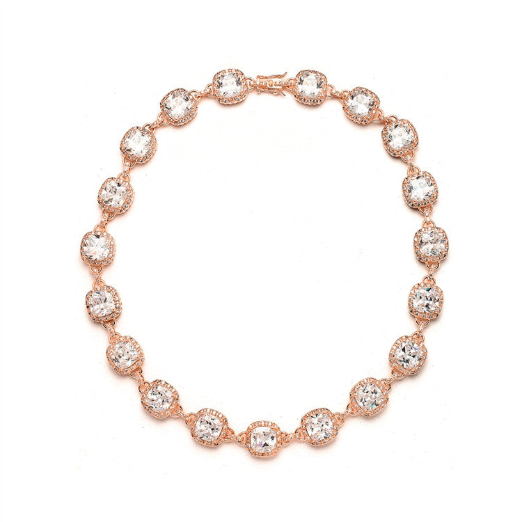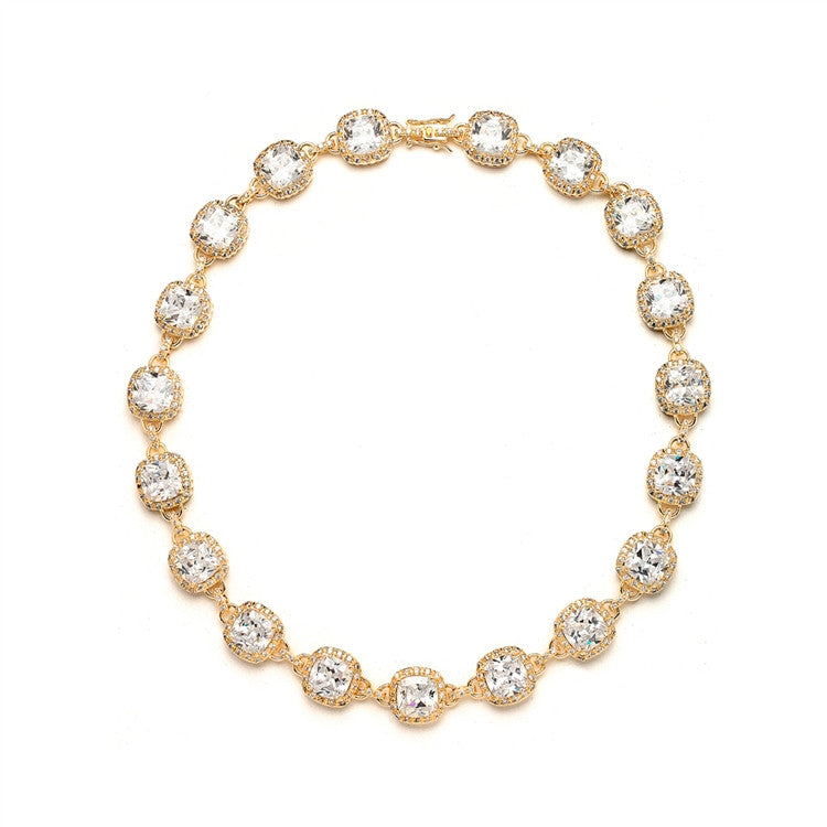 Mariell's 17" bridal necklace has a stunning design of cushion cut stones surrounded by pave cubic zirconia. With a high-polish gold finish, this beautiful necklace looks like vintage diamond jewelry.