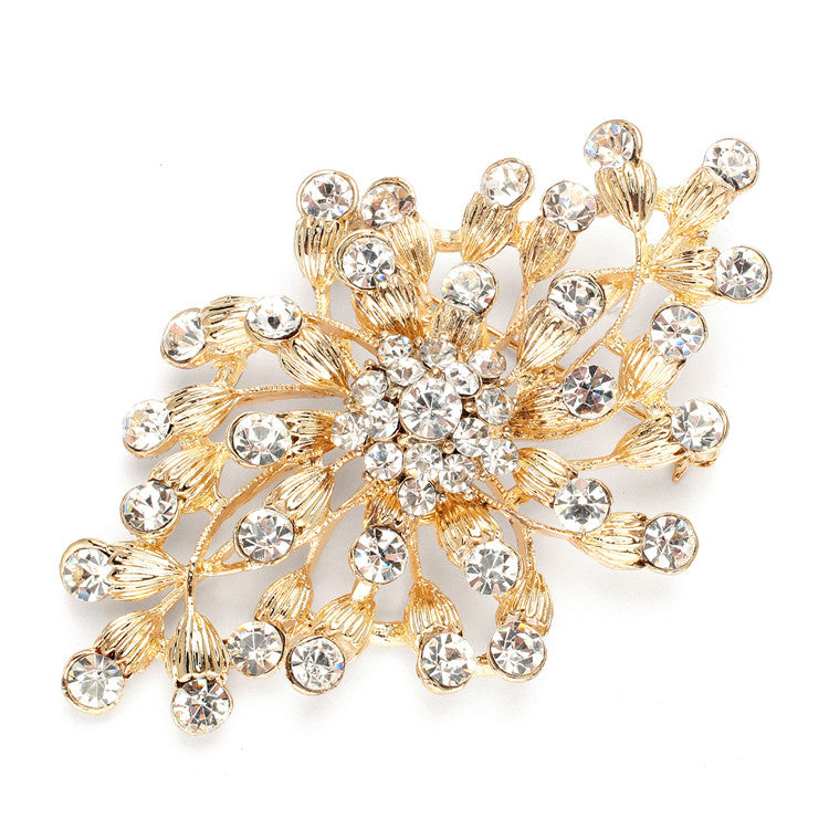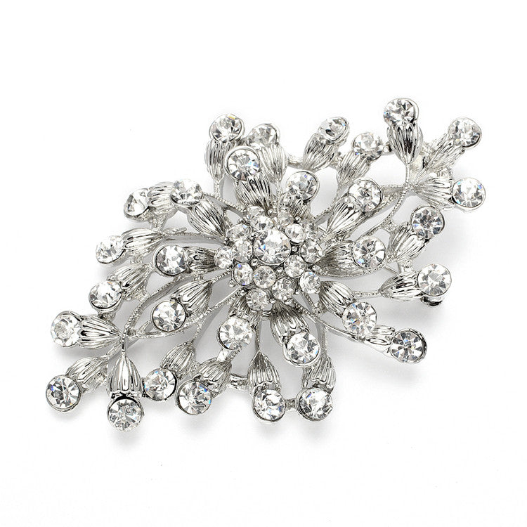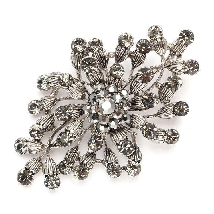 Our lavish 3 1/4" w x 2" h antique silver brooch has budding floral sprays with black diamond crystal blossoms. Our pin adorns gowns, sashes, faux fur wraps at a super low price & makes a couture hair accessory using our comb adapter (sold separately).