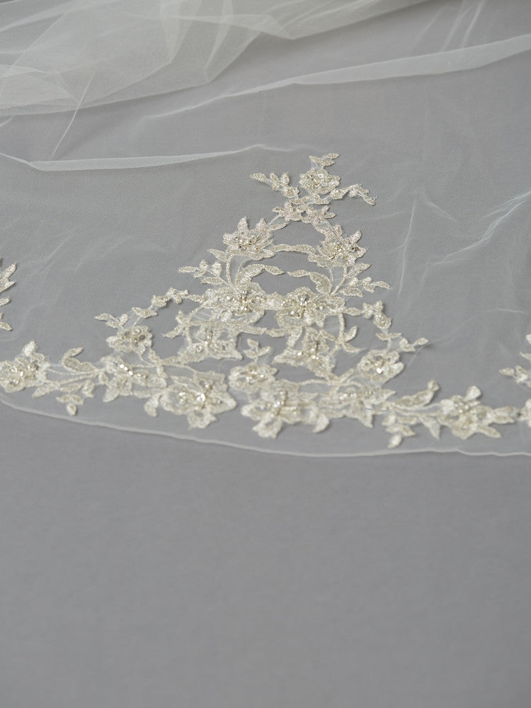 Cathedral Wedding Veil with Silver Embroidered Beaded Lace Appliques & Pencil Edge 4417V-I-S