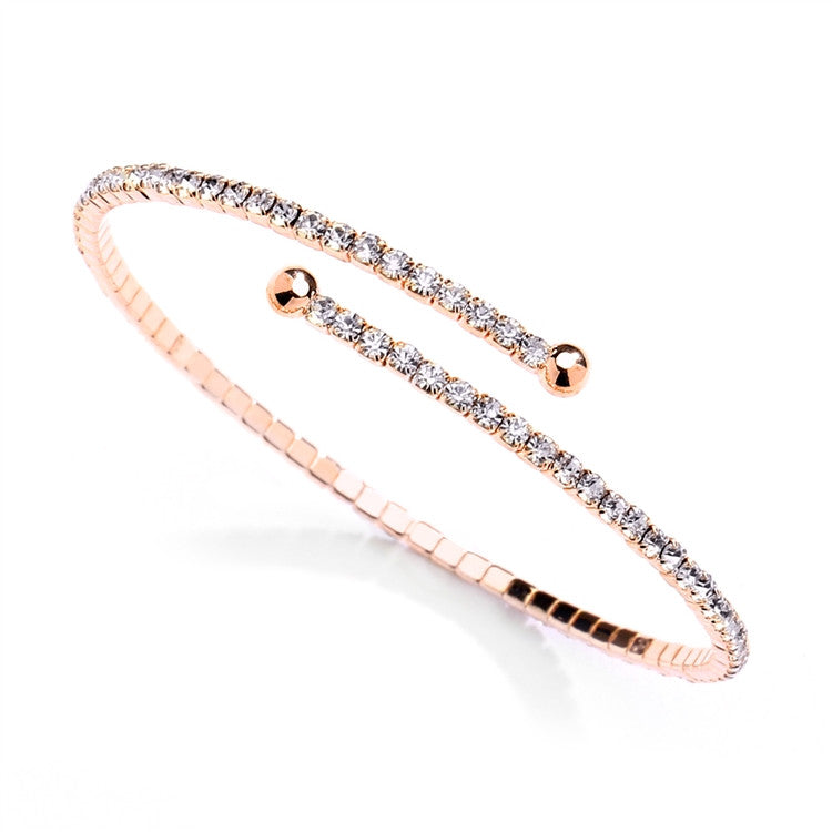 Mariell's Silver / Rose Gold rhinestone coil bracelet adds the perfect amount of sparkle to any occasion! With a delicate single row of baby rhinestones, this faux diamond bracelet will add an elegant touch to any wedding, prom or formal gala. One size fits all. Designed to fit any size wrist, our delicate one-row rhinestone coil bracelet is the perfect addition to any jewelry collection.
