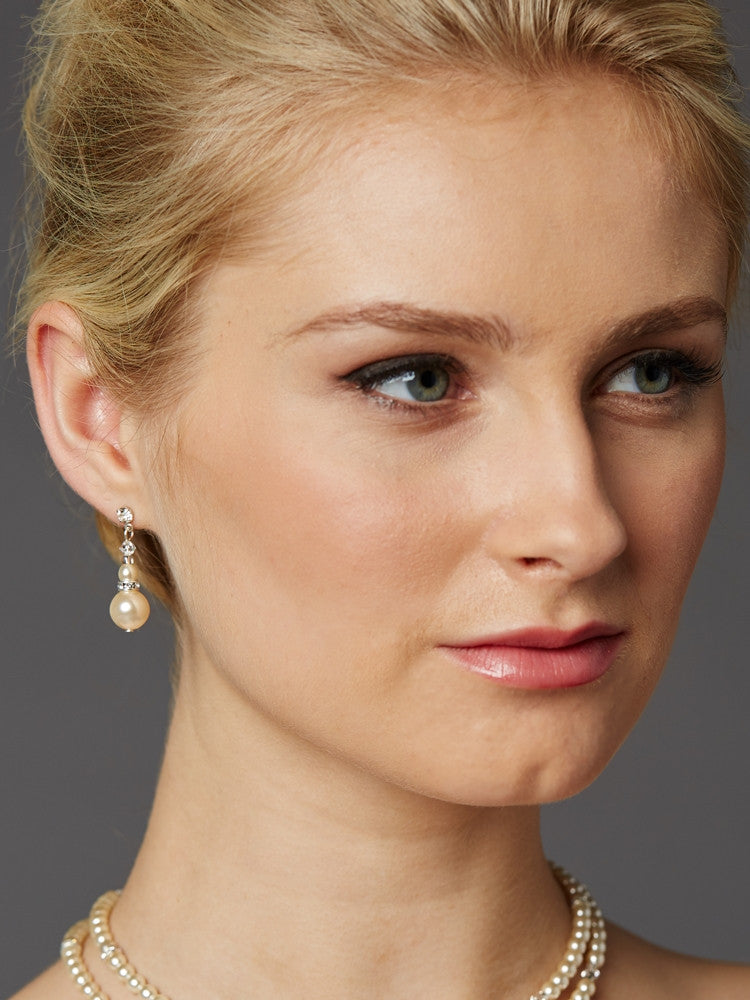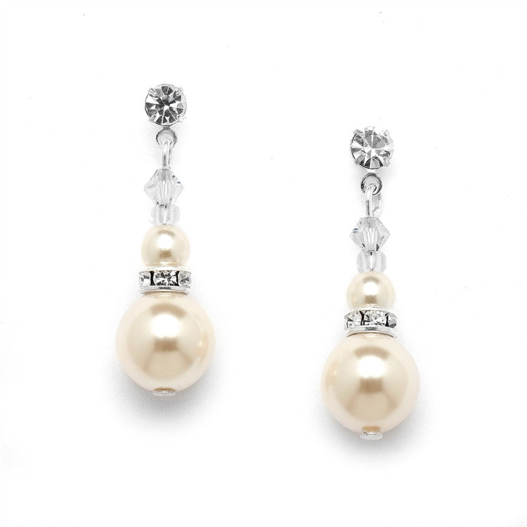 Mariell's glass pearl wedding earrings are the quintessential bridal accessory. These understated Light Ivory dangle earrings feature 5mm & 10mm pearls, clear crystals and Genuine Sterling Silver plated rondelles. Handmade in the USA. 1 1/4" h. These elegant glass pearl wedding earrings are a "must have" for any bridal jewellery collection. Our hand-crafted double pearl dangle earrings make great prom earrings or bridesmaids gifts at an attractive low price. Pair these beauties with our Light Ivory back necklace 4472N-LTI-S