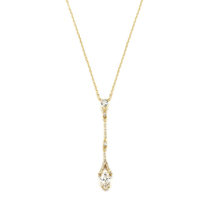Mariell's 14 1/2" - 16" adj. Gold Cubic Zirconia necklace has a delicate 1 7/8" h linear pendant. The micro pave CZ's add subtle sparkle to any bridesmaid, prom or wedding gown. Our Gold CZ necklace makes a bold statement with understated beauty!