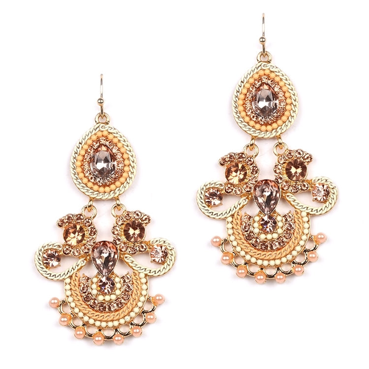 These glorious statement earrings have the sweet look of a dreamy wedding cake iced to perfection. Our chandeliers are hand-adorned with intricate Pink Crystal gems, baby pearls and bead chain for a blissful marriage of glamour and whimsy. 2 1/2" h 1 1/4" . Our "Icing on the Cake" chandelier earrings are as sweet as they sound and look even sweeter with a wedding, bridesmaid, graduation or prom gown. An irresistible blend of Pink crystal gems, pave champagne crystals and intricate pink and peach bead chain.Grab 'em in all the colors and watch these beauties get scooped up! Shown in Pink Crystal /Peach/Champagne with Brushed Gold.