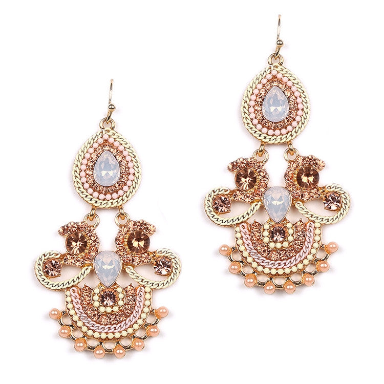 These glorious statement earrings have the sweet look of a dreamy wedding cake iced to perfection. Our chandeliers are hand-adorned with intricate Pink Opal gems, baby pearls and bead chain for a blissful marriage of glamour and whimsy. 2 1/2" h 1 1/4" w. Our "Icing on the Cake" chandelier earrings are as sweet as they sound and look even sweeter with a wedding, bridesmaid, graduation or prom gown. An irresistible blend of Pink Opalescent gems, pave champagne crystals and intricate pink and ivory bead chain make these chandeliers a must-have confection for your jewelry display.