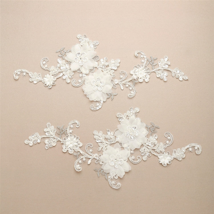 These exquisite European lace and crystal applique sets are ideal embellishments for ivory bridal gowns, veils, sashes and headpeices. With georgette flowers, Austrian crystals, sequins and beads, each applique trim is 11 5/8" h x 5 3/8" w. Hand-crafted. Intricate crystal and ivory lace appliques are meticulously hand-made embellishments to create one-of-a-kind designer wedding gowns, sashes, headpieces, veils and ring pillows. These georgette flower lace appliques are sold in pairs and will set your designs apart from the rest with exquisite European style. Brilliant style and the finest quality available make this a must-have bridal applique.