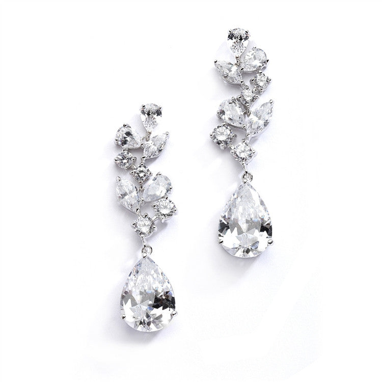 All eyes are on you as you enter the room in these magnificent Genuine Rhodium Silver Cubic Zirconia wedding earrings by Mariell. At 2 1/8" h x 1/2" w, our earrings boast a mosaic of CZ's at the top and a bold pear shaped drop for pure glam!.