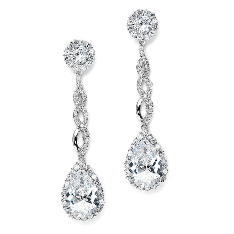 Mariell's 2 3/8" h opulent wedding earrings have haute couture styling with fiery pear-shaped Cubic Zirconia drops plated in silver rhodium. Our magnificent earrings will turn heads at any wedding or special affair with their brilliant sparkle and design.