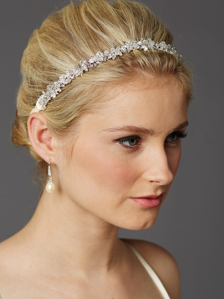 For the bride who desires simplicity with a stunning element of glamour, this  bridal headband by Mariell is the perfect choice. Slender and flexible, this wedding headband abounds with hundreds of crystals packed into a lovely sleek design. The embellished band spans 9 3/4" across and the ivory satin ribbons measure 15 1/2" on each side. Clusters of genuine crystals are hand-wired to a silver headband creating a stunning bridal headpiece. Glistening with dainty pave leaves, the slender silhouette of this vintage wedding headband adds understated glam to any bridal hairstyle. 9 3/4" across.