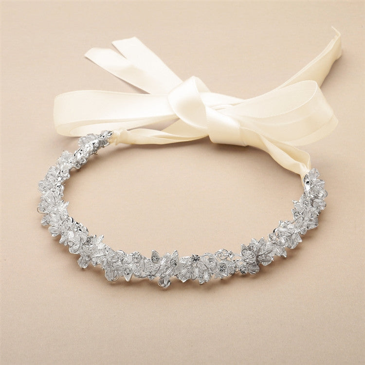 Slender Bridal Headband with Hand-wired Crystal Clusters and Ivory Ribbons 4431HB-I