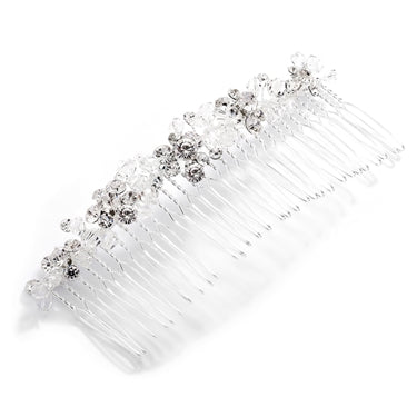 Mariell's bridal headpiece has clusters of clear rhinestone and Swarovski crystals. This tiara comb will light up your wedding veil. Mariell's exquisite bridal tiara comb features brilliant clusters of clear rhinestone and genuine Swarovski crystals. This crystal headpiece will light up your wedding veil with irresistible sparkle. Our stunning bridal tiara comb measures 4 1/4" w x 3/4" h with a pliable silver comb.