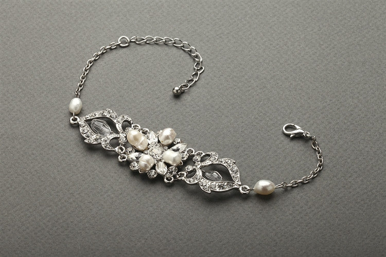 Mariell's lovely Freshwater Pearl and Crystal Wedding Bracelet adds a beautiful vintage touch to your wedding, bridesmaids or prom dress. Our adj. 7" - 9" Bracelet is 1" h and the pave design is 4" across. We have a captivating matching neck set 4060S.
