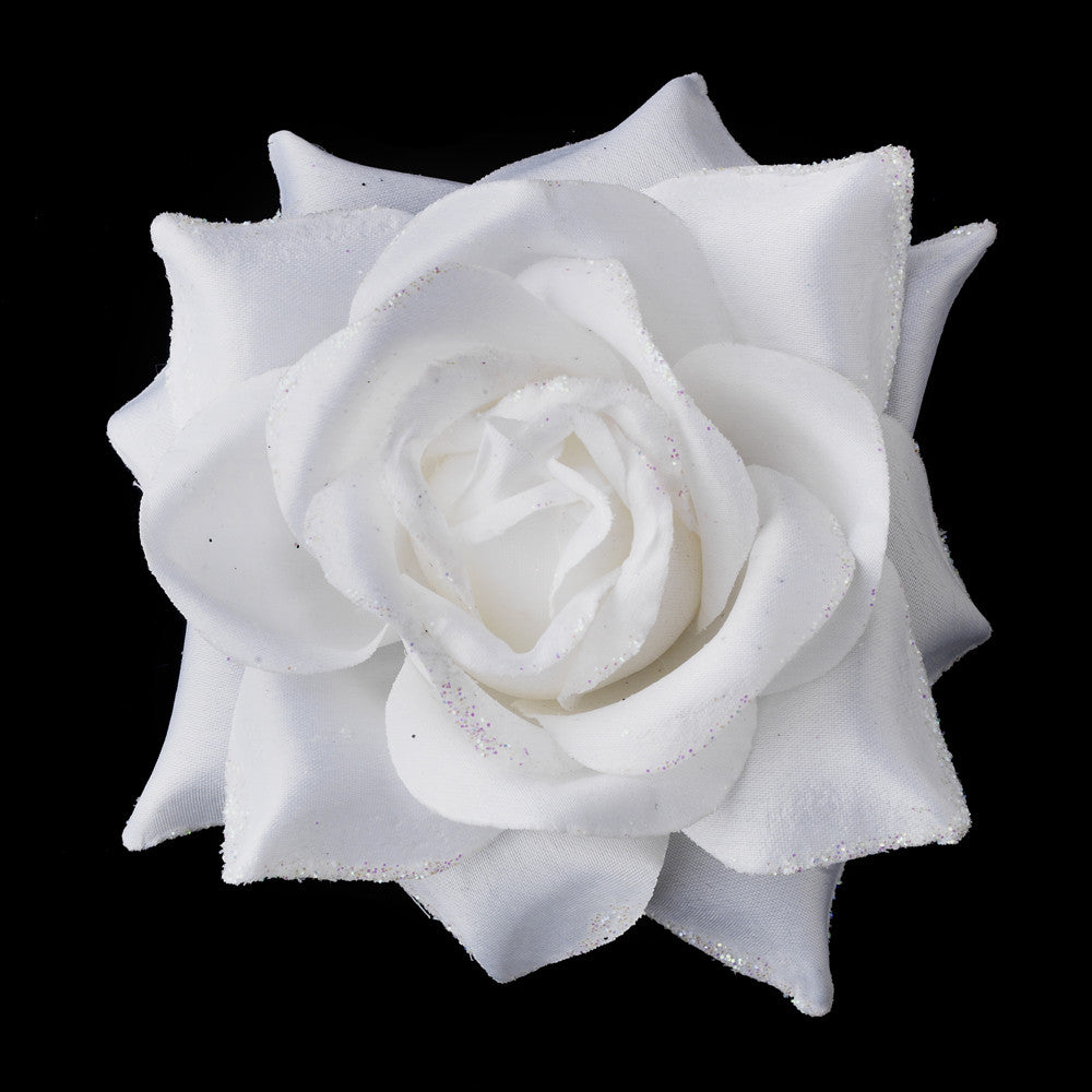 This pretty matte satin flower with elegant ridges adds the perfect finishing touch to your hair or special occasion gown. This beautiful flower will add style and glamour to your hair or dress. These flowers are perfect for wedding hair styles, bridesmaids up do’s, prom or party hair styles. This beautiful rose is very versatile. The back of the flower has a hair elastic or clip to easily add in your hair. There is also a pin so this flower may be worn as a brooch on a gown. This may also be used as a corsage.