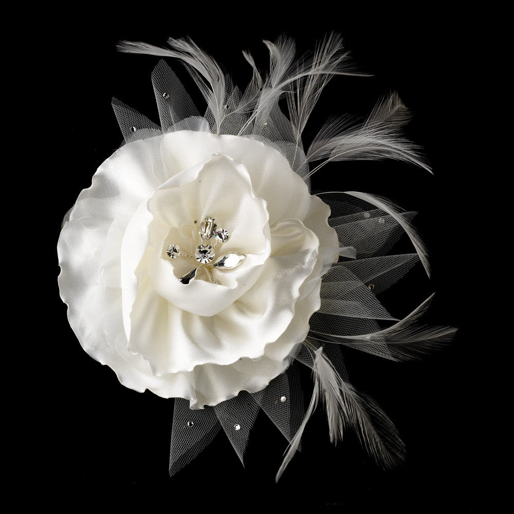 This fabulous feather spray clip with fabric floral detailing embellished with clear rhinestones is the perfect additon to add some sparkle to your bridal ensemble whether its to your dress or hairstyle you'll be sure to shine!