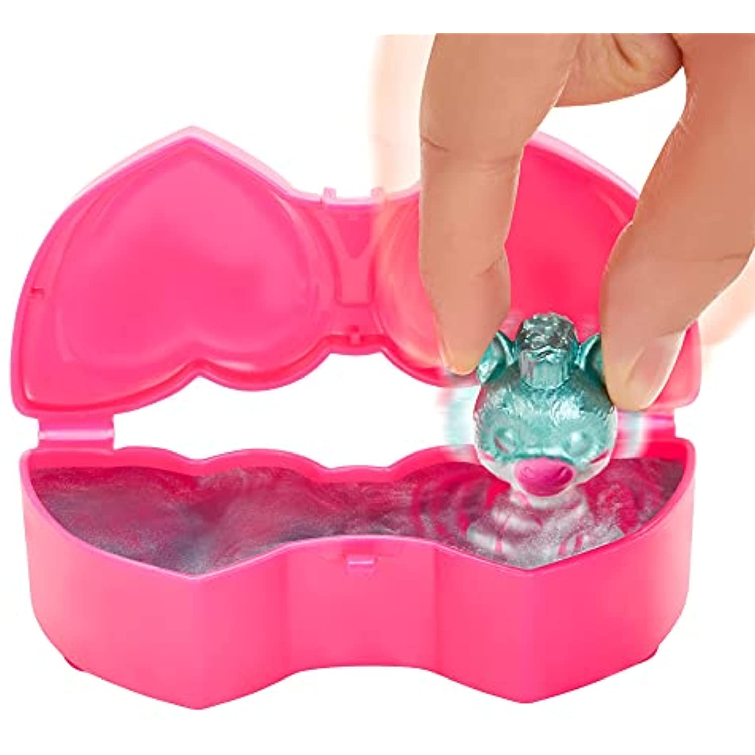 Barbie® Color Reveal™ pets deliver an unboxing experience full of surprises -- five of them! The mini case, shaped like sunglasses, holds three mystery bags hiding a Color Reveal™ pet figure and three surprise items! Dip the mystery pet covered in Color Reveal™ teal into water. The water turns a teal color, and when the pet is pulled out, its features are revealed!