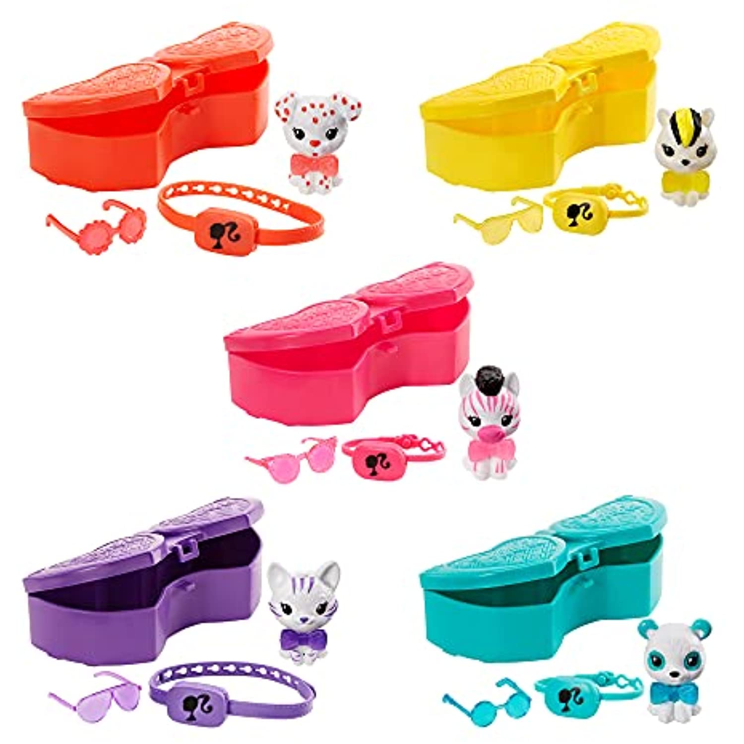 Find a dalmatian puppy, baby tiger, panda bear, skunk or a zebra once revealed, but the surprises continue…open the rest of the surprise bags to discover a fanny-pack and sunglasses for Barbie® and a cute little bow accessory for the pet. Each pet has a color design that matches the accessories and the case for a fun, monochromatic look. Use the pieces to play out stories or display the pet inside the sunglasses.