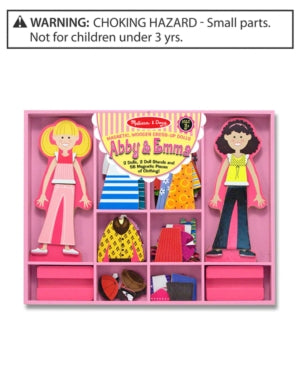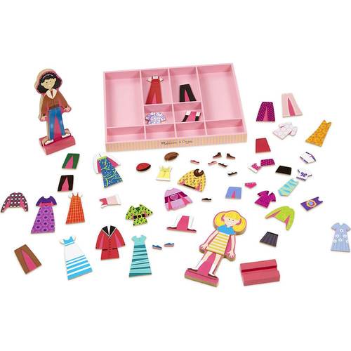 This magnetic dress-up dolls play set makes kids the stylists! This wooden play set includes 2 doll figures and 56 pieces of magnetic clothing that fit onto either one. Mix and match hundreds of possible doll outfits, then rearrange the pieces to change them again and again. Each magnetic fashion doll comes with a wooden stand for display and pretend play. The complete fashion play set fits in a sturdy wooden storage tray that keeps everything in its place! This magnetic dress-up set provides kids with multiple play activities. Parents and older kids can ask children to dress Abby and Emma, then tell a story about where they are going and what they’ll be doing. Kids can count the number of shoes or other articles of clothing in the set, trace the pieces on paper and let kids color them in, or assist in cutting out the new outfits that can be temporarily affixed to the existing pieces. The Abby and Emma Magnetic Dress-Up Set makes an exceptional gift for kids ages 3 to 6 years. Add the Melissa and Doug Delu