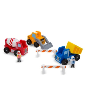 Melissa & Doug Construction Vehicle Wooden Play Set (8 pcs):Set of 3 sturdy wooden 5" construction vehicles and 2 road barriersIncludes a dump truck, cement mixer, front loader and 4 play figuresTruck bed tilts, mixer spins and loader liftsPlay figures fit into the driver seats and can also stand independentlyEncourages hand-eye coordination and fine motor skillsPromotes imaginative play