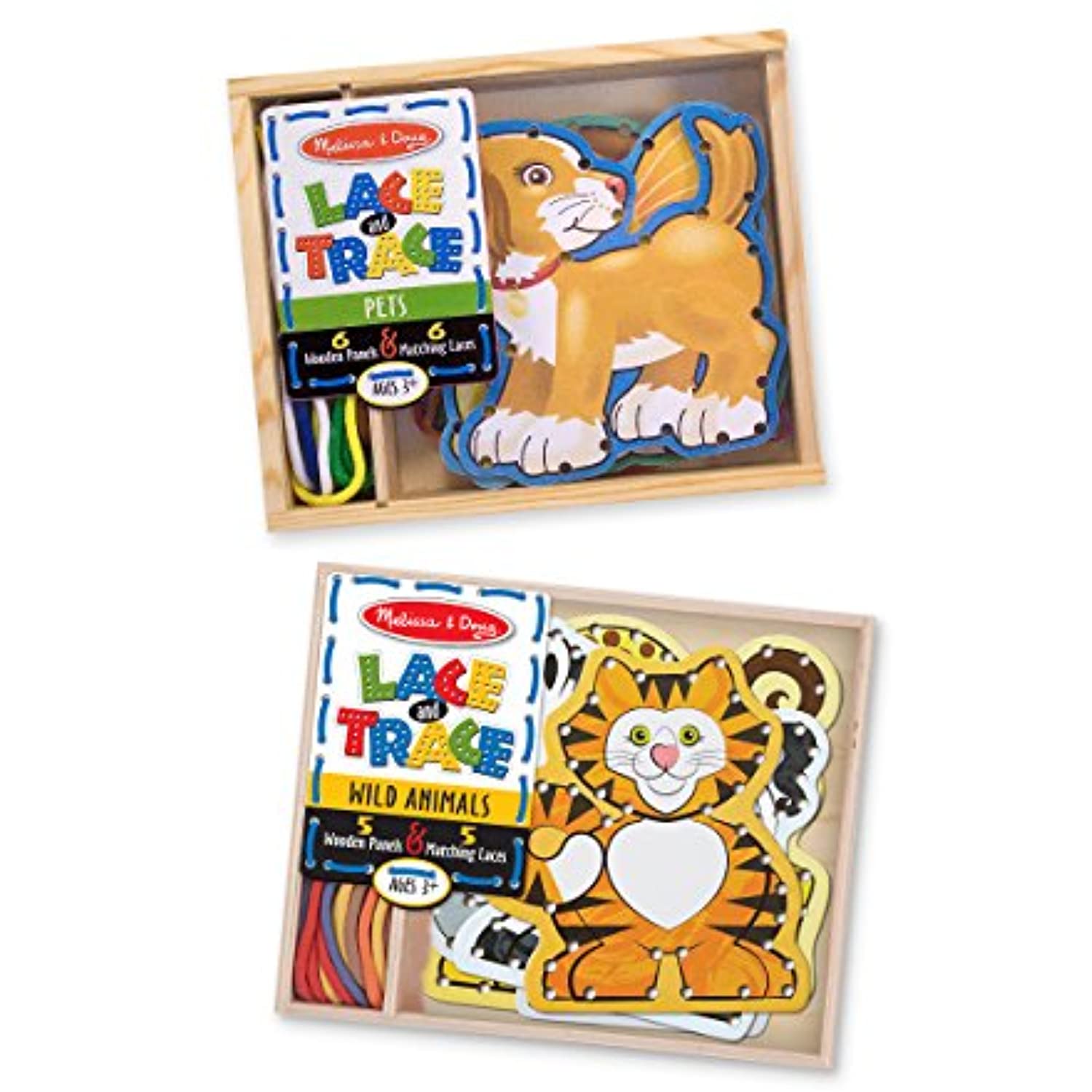 Product Description Children will have endless fun practicing their lacing and tracing skills with these brightly colored wooden panels and laces. As they learn the ins and outs of charming critters with the Farm Animals and Pets sets, children will develop eye-hand coordination and attention skills. Each set includes five double-sided panels and five color-coordinated laces. From the Manufacturer From classic wooden toys to crafts, pretend play, and games, Melissa & Doug products provide a launch pad to ignite imagination and a sense of wonder in all children so they can discover themselves, their passions, and their purpose. Since the company’s founding more than 25 years ago, Melissa & Doug has consistently delivered innovative products that inspire open-ended thinking, encourage kids to see new possibilities, and offer Countless Ways to Play. It’s part of a bigger vision to Take Back Childhood. Because by giving children a true childhood with the space and freedom to explore their world, we give them a path to realizing their full potential!