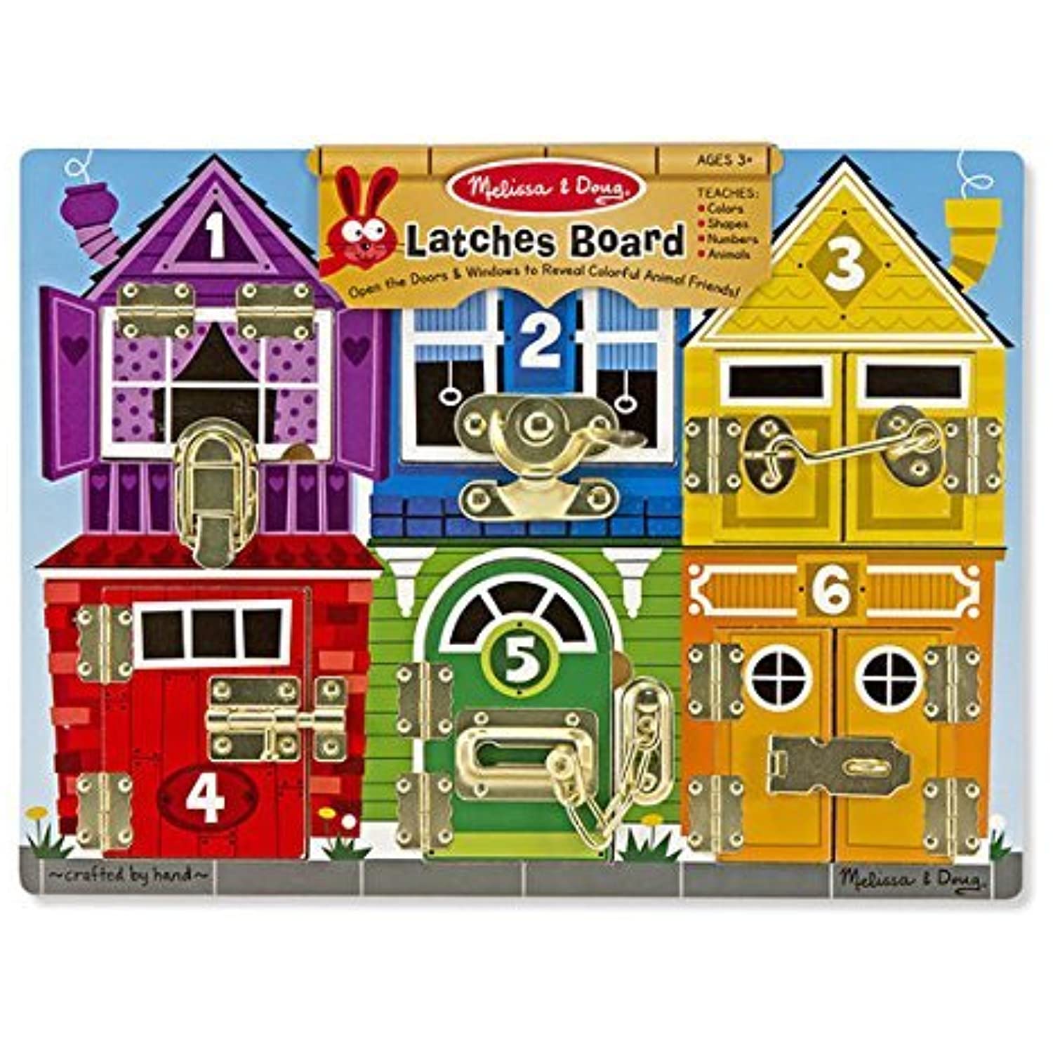 - LATCHES BOARD ACTIVITY SET; Activity play board helps kids build dexterity as they figure out how 6 different latches work including, Latches hook, snap, click, and slide.