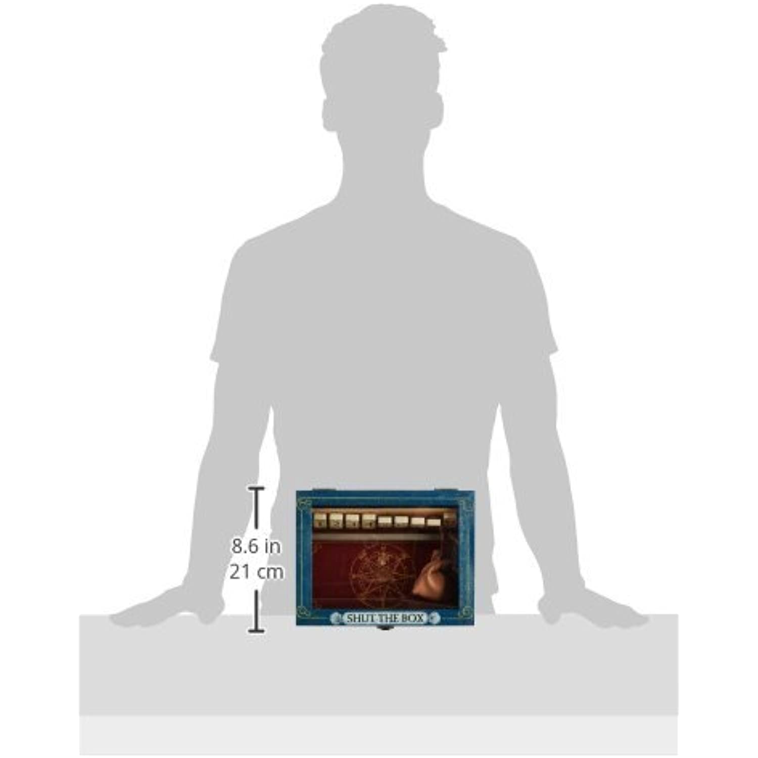 - Solid-wood case with a see-through, latching lid houses, 9 flipping number tiles and two wooden dice