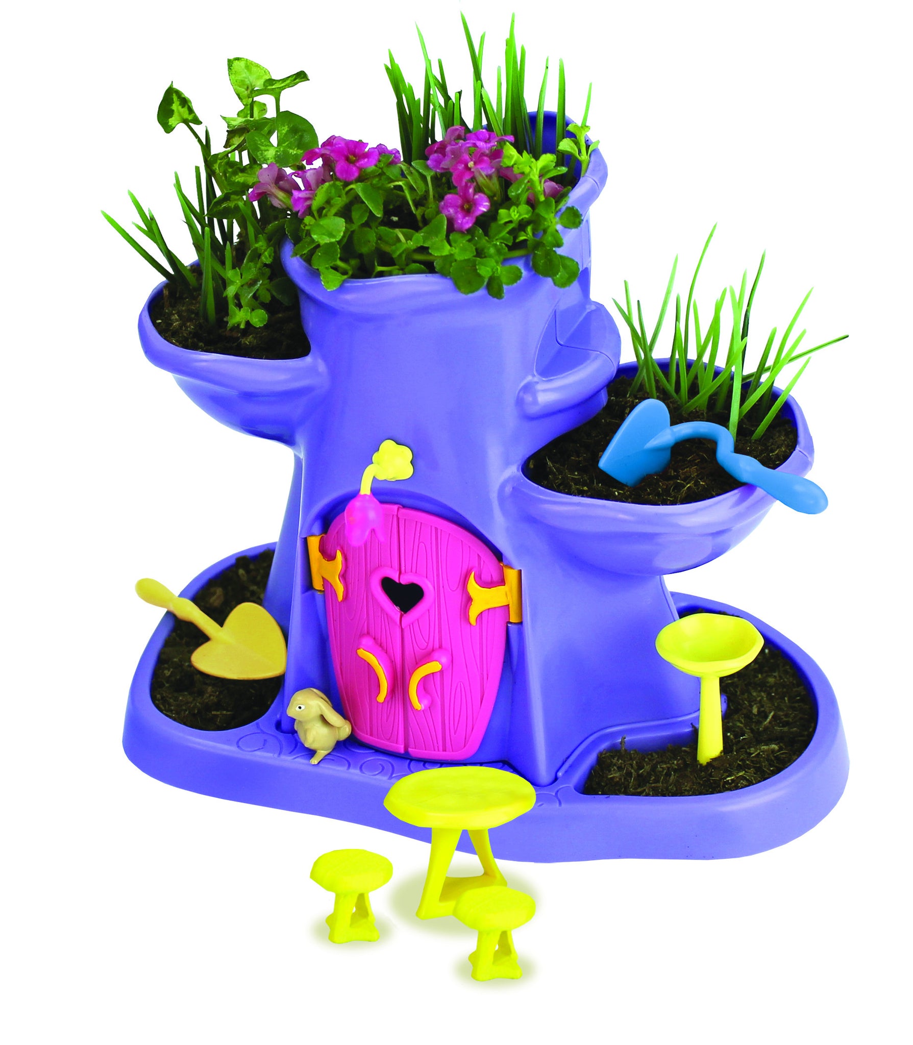 It's a charming, bright fairy home! The set includes the adorable tree hollow with opening doors, bottom tray, Willow the fairy, her bunny friend Nibbles, and gardening accessories and tools. Also included are soil and quick-germinating seeds to get your garden started! Children can add other flowers or plants if they want, too! It’s a fun grow-and-play set!