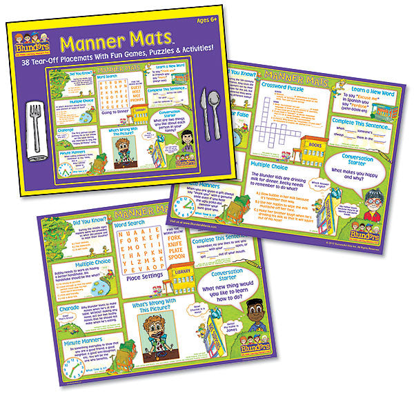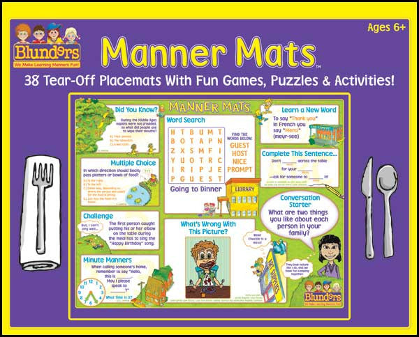 Manner Mats are fun and educational tear-off placemats that teach kids table manners and social skills using entertaining games, puzzles and activities. Use them at home or take them along when dining out.