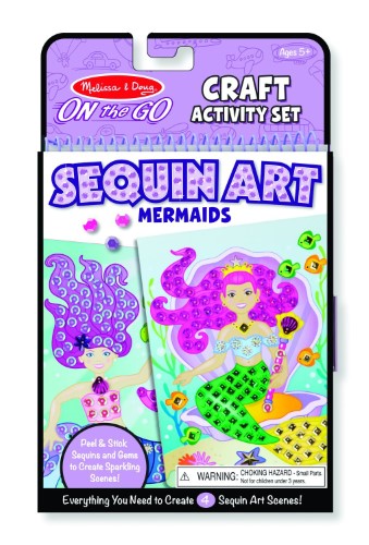 Melissa & Doug On the Go Sequin Art Craft Activity Set: 500+ Sequins and Gems and 4 Scenes - Mermaids:Craft kit comes with everything needed to create 4 shimmering sequin art mermaid scenesIncludes 4 peel-and-decorate pages, 500 multi-colored sequins, 8 gems, 9 shaped sequins and pick-up toolPress the sequins and gems on the outlined dots to make the pictures sparklePromotes fine motor skills, creativity and concentrationAges 5+6" x 10" x 1"
