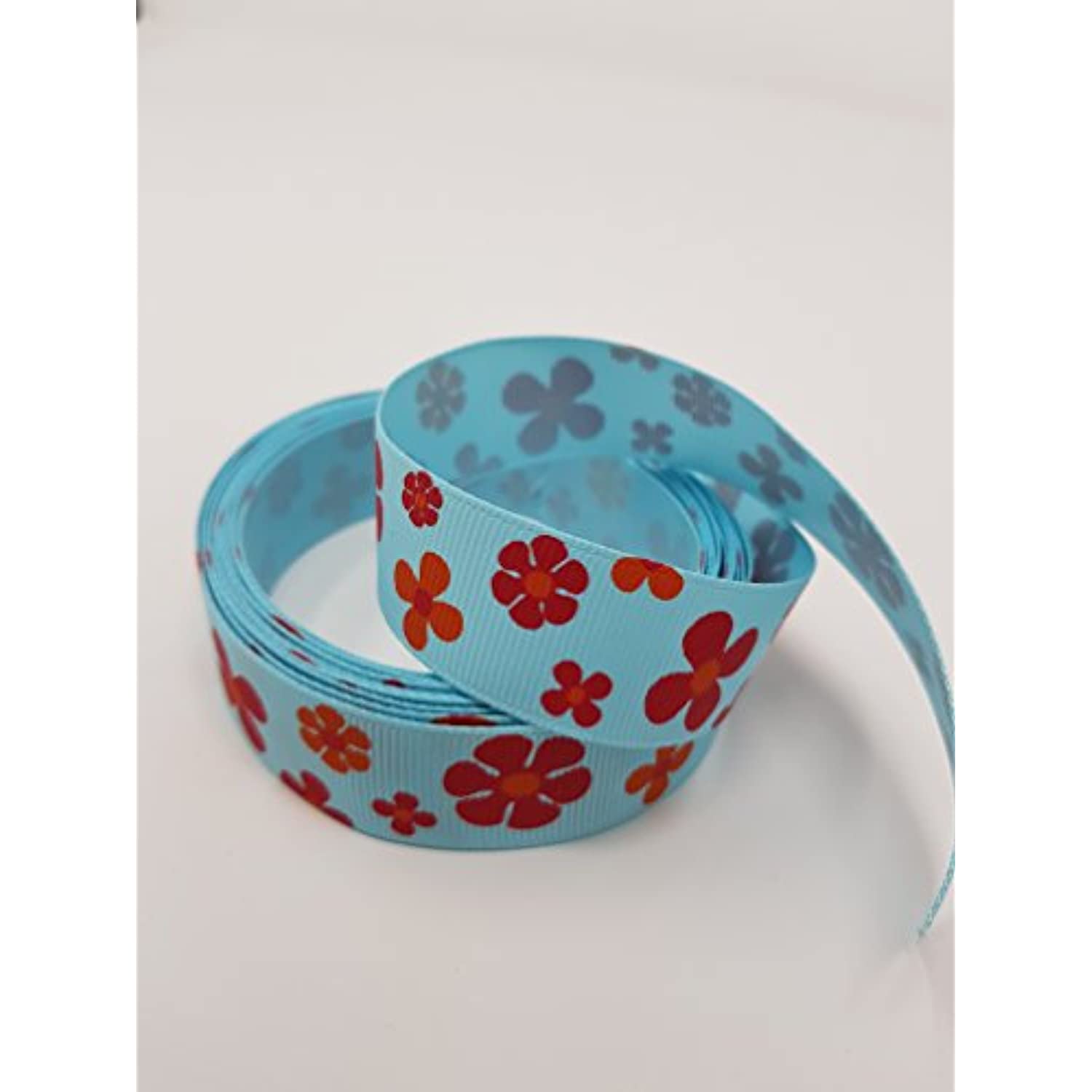 Polyester Grosgrain Ribbon for Decorations, Hairbows & Gift Wrap by Yame Home (7/8-in by 1-yd, ys07030205f - Red Orange Flowers w/Blue Background)