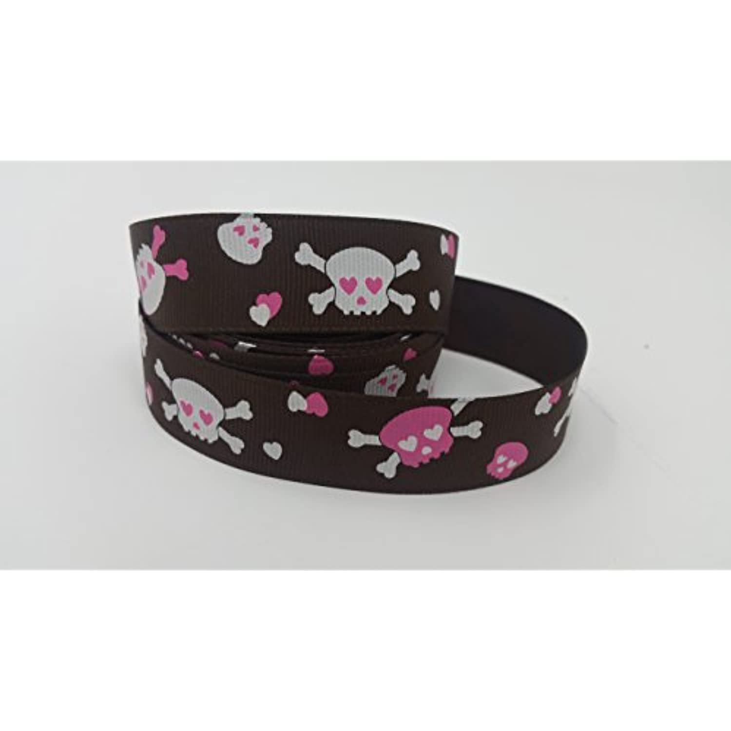 Polyester Grosgrain Ribbon for Decorations, Hairbows & Gift Wrap by Yame Home (7/8-in by 5-yds, white and magenta skulls w/brown background)