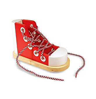 I can do it myself!" Few things will give your child more satisfaction than mastering shoe lacing and tying skills. This wooden high-top sneaker from Melissa and Doug will make practicing enjoyable and help your child reach this developmental milestone."