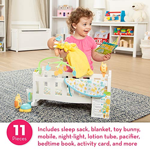 - BEDTIME PLAY SET: The Melissa & Doug Bedtime Play Set includes a sleep sack and blanket with adorable animal characters, stuffed toy bunny, spinning mobile, working night-light (2 AA batteries required, not included), lotion tube, pacifier, bedtime book, and double-sided reusable activity card.