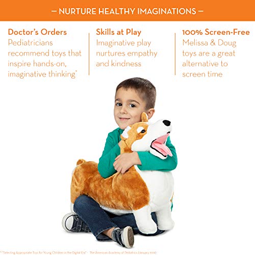 This adorable and beautifully constructed lifelike plush Corgi may be “low down,” but it will never be “short” on hugs, cuddles, and love! Quality construction and realistic details, like big ears and short legs, make this popular dog a durable and lovable pal. Standing approximately 16 inches tall and 22 inches long, the brown and white Corgi is sturdy but super-soft and huggable. For more than 30 years, Melissa & Doug has created beautifully designed imagination- and creativity-sparking products that NBC News called “the gold standard in early childhood play.” Today, Melissa & Doug is proudly partnering with the American Academy of Pediatrics to foster early brain development and help children build important life skills through play.