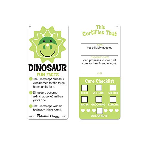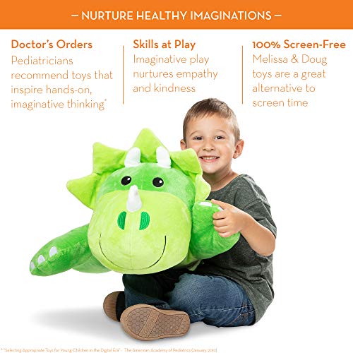 This soft and cozy oversized prehistoric pal is just waiting to be cuddled! Squeezable and huggable, this sweet-faced two-toned bright green triceratops dinosaur with a frill-like shield, three soft horns, a floppy tail, and wide, squishy feet measures approximately 27.5 inches long by 10 inches high by 22 inches wide — sized just right for big hugs from kids of all ages. Cuddle Dinosaur comes with a sewn-on collar, a name tag to personalize, and a double-sided adoption certificate/care checklist and fun facts card. The pillow-y soft Cuddle Dinosaur is always ready for some giant hugs! For more than 30 years, Melissa & Doug has created beautifully designed imagination- and creativity-sparking products that NBC News called “the gold standard in early childhood play.” Today, Melissa & Doug is proudly partnering with the American Academy of Pediatrics to foster early brain development and help children build important life skills through play.