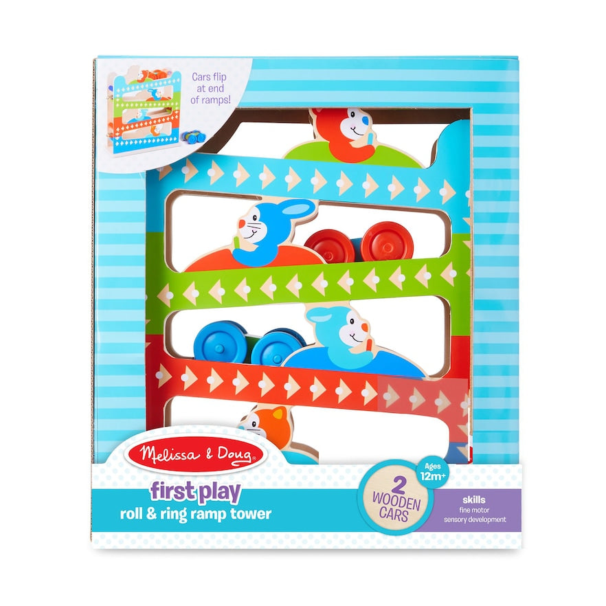Keep playtime rolling with two wooden cars that zoom, zip, ring, and flip down the wooden zig-zag track! Kids 12 months and older will delight in dropping a car at the top of the tower and watching as it chimes at each turn and then flips over to zoom down the next ramp. This engaging, hands-on activity encourages sensory development along with both fine and gross motor skills. First Play toys feature bright colors, bold patterns, and whimsical designs that boost skills while sparking imagination and wonder—right from the start! The Melissa and Doug First Play Roll and Ring Ramp Tower teaches infants vital developmental skills including fine motor, gross motor, sensory, and color identification. To enrich kids’ learning as you play, say the color of the cars as you point to them;, place cars just out of reach to inspire kids to move and reach for them; and challenge kids to crawl around the ramp tower. The First Play Roll and Ring Ramp Tower makes a great gift for kids ages 12 months and up. Add the Firs