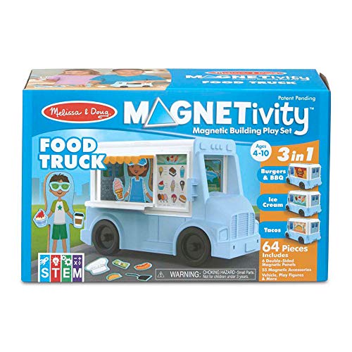 - 64-piece Magnetivity Magnetic Building Playset Food Truck lets kids design, build, and play with their own BBQ, ice cream, and taco truck vehicle again and again