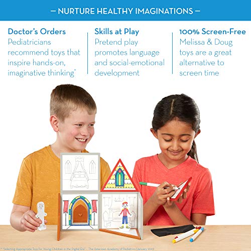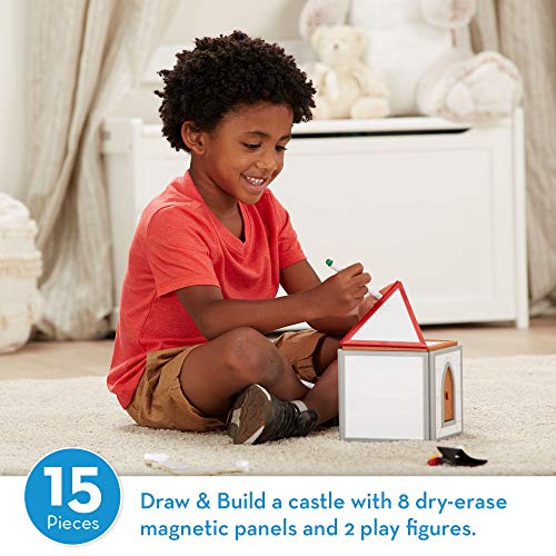 Build an imaginary kingdom with the Magnetivity™ Magnetic Building Play Set Draw & Build Castle! Magnetivity™ encourages kids to experiment, explore, and imagine by inspiring them to design and build their own unique worlds! The 8 double-sided dry-erase panels have line art on one side and are blank on the other, so kids can use the four included dry-erase markers to create and color scenes. Color in the two wooden play figures in stands, too. Use the cloth to erase and draw again! These unique panels magnetically attach in different combinations, so kids can draw on and build new designs for their castle every time they play. Great for open-ended, hands-on exploration and play! All Magnetivity™ panels are compatible. (All panels magnetically attach, but magnetic accessories from other Magnetivity™ sets do not stick to Draw & Build panels.) Pediatricians say building and rebuilding provide lessons in resilience. Assembling parts, as kids do with these Magnetivity kits, can also promote visual-spatial awareness. Magnetivity makes a great gift for 4-year-olds, 5-year-olds, 6-year-olds, and up. Even many 10-year-olds will enjoy building and creating with Magnetivity. For more than 30 years, Melissa & Doug has created beautifully designed imagination- and creativity-sparking products that NBC News called “the gold standard in early childhood play.” Today, Melissa & Doug is proudly partnering with the American Academy of Pediatrics to foster early brain development and help children build important life skills through play.