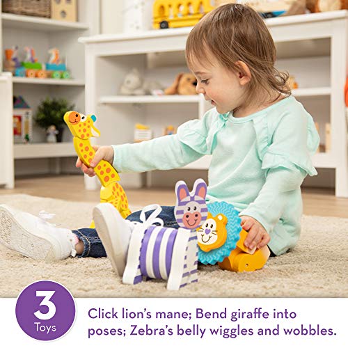 - WOODEN GRASPING TOYS: This 3-piece set of sturdy wooden grasping toys features friendly safari animals. Click and spin lion's mane, grip and bend giraffe, and watch zebra's belly wiggle and wobble! A delight for the senses.