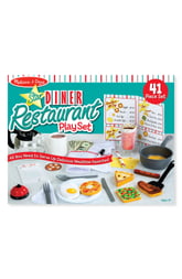 Order up! Everything kids need to serve up delicious diner classics is included in this 41-piece restaurant play set collection. Order on the reusable menu, cook with the durable plastic frying pan and spatula, and serve using a full place setting. Seven wooden food pieces have different food options on either side, and there are even double-sided milkshake and hot drink inserts. Servers and chefs can wear the apron and ring the bell when meals are ready, and customers can pay their bill (use the dry-erase marker on the guest check) with the included play money. Kids three and older hungry for imaginative play are sure to be satisfied! The diner play food set also includes, a fabric napkin, an apron with pockets, a working bell, a menu, a guest check, a dry-erase marker and play money. All this inspires children 3 and up to enjoy hours of hands-on, screen-free pretend play. The Star Diner Play Set makes a great gift for kids ages 3 and up. For more diner-themed play, consider adding the Melissa and Doug Star