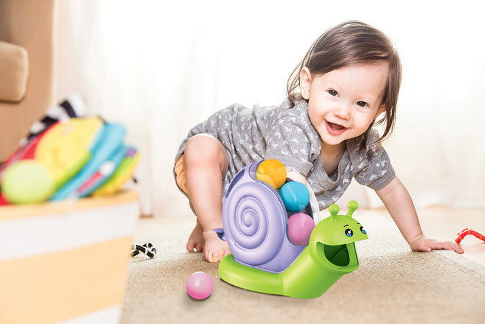 The adorable snail is full of fun! Drop the balls into the shell and watch them pop out of Shellby's mouth when you tap the tail, or when you roll Shellby along the floor! Includes four nearly-2" balls for lots of droppin', poppin', rollin' fun!