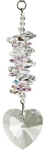 A faceted heart pendant is topped by a cascade of rose and clear crystals. This sweet cluster of clear and pink crystals lead the eye to the jewel-like clear crystal heart drop. This sun catcher sparkles and shines in the light, spreading rainbows across the wall. Works equally well as an every day or Christmas holiday ornament. Hang it in your office or dorm room it's especially beautiful when hanging in the window or in front of a light. Not boxed, instead it comes with a sheer organza gift bag.