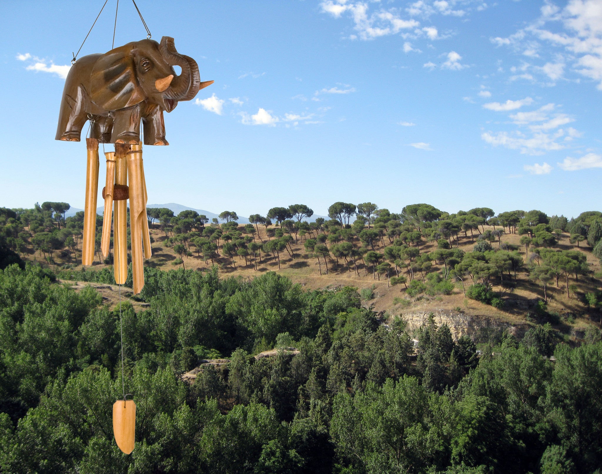Materials: Hand-carved, hand-painted wood elephant, 6 bamboo tubes.