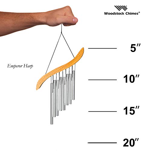 Product Description Tuned to an exotic scale, the Harp has a gentle, shimmering sound. Inspired by traditional Asian design; intended to reflect balance, harmony and beauty. Amazon.com The lovely, organic silhouette of this Emperor Harp chime from Woodstock Percussion is a perfect match for its delicate sound. Carved from a single piece of hardwood, the curved support features a highly visible grain, a rich cherry stain, and a weather-protective coat. A professional musician and instrument designer has tuned the chime to a shimmering sound, designed to evoke a spirit of adventure. The Emperor Harp features eight weather-resistant aluminum tubes secured to the support by a fine black cord. A slightly thicker black cord, pre-tied with a hanging loop, supports the entire chime. --Emily Bedard