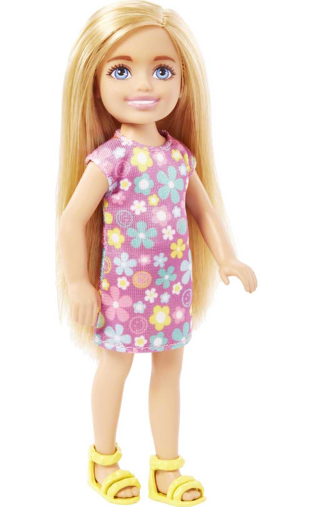 - Chelsea doll's blonde hair is styled long and straight, and yellow sandals complete her look.