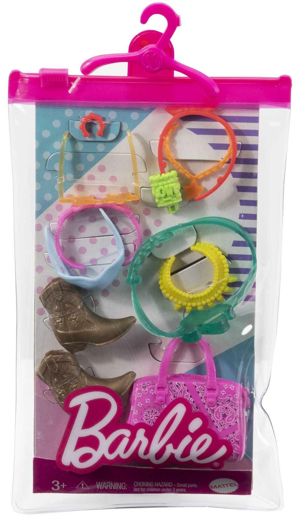 This accessory pack for Barbie® doll inspires styling and storytelling with 11 pieces featuring a western theme. Items include fashion accessories like a paisley tote and cowboy boots, as well as fun storytelling pieces like a cactus belt, star sunglasses, a mask and more. Mix and match with other clothing and accessories in the line.